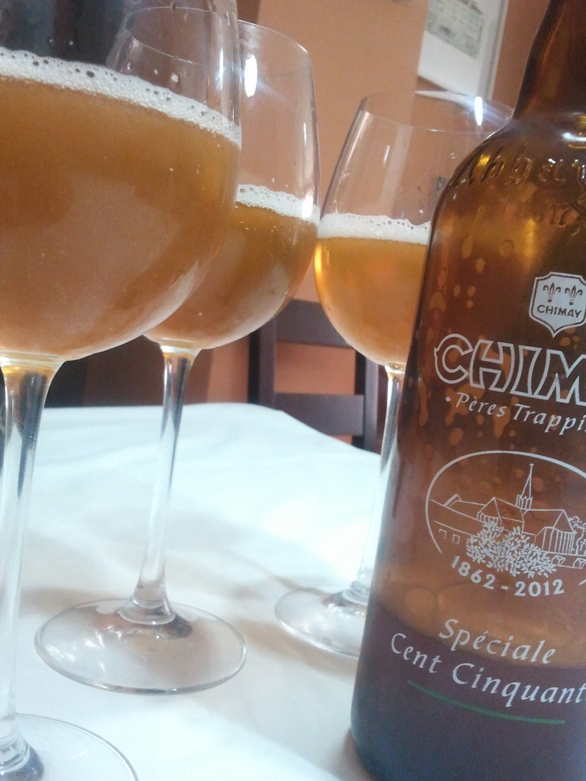 Como la Birrapedia la integramos tres personas, socios, cerveceros o como queráis definirnos y además cada uno tiene sus obligaciones personales y familiares durante el fin de semana, decidimos adelantar nuestro #FFdA a una de las comidas que solemos mantener para hablar de la evolución de la web, etc, etc… Para empezar y como los tres presentes sumamos la nada despreciable cantidad de 150 años (cada uno, los suyos) pues nada mejor que una excelente cerveza belga, edición especial, de Chimay, precisamente para conmemorar lo que los americanos llaman sesquicentenial de la marca. Una excelente birra, de 10 grados, con un final muy aromático y lupulizado… muy rica.