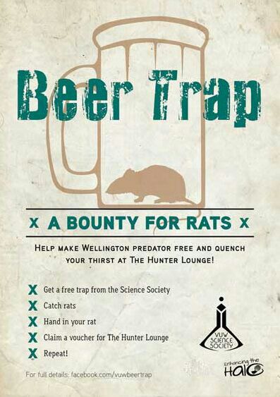 Curiosa iniciativa la llevada a cabo en Wellington, Nueva Zelanda para prevenir la ‘peste’. Ni más ni menos que recompensar a los estudiantes por cada rata, muerta o viva que cacen en sus pisos y residencia con una cerveza gratis. En una campaña por limpiar de roedores la ciudad, se pensó en como poder estimular a la comunidad estudiantil y entonces a alguien se le ocurrió sugerir que si lo que quieren los estudiantes es cerveza y precisamente en sus pisos hay ratas… entonces BINGO!. Se desconocen aún los resultados de la campaña en la que se han entregado unas 100 ratoneras a los jóvenes para que puedan así cazar sus roedores y sus cervezas.